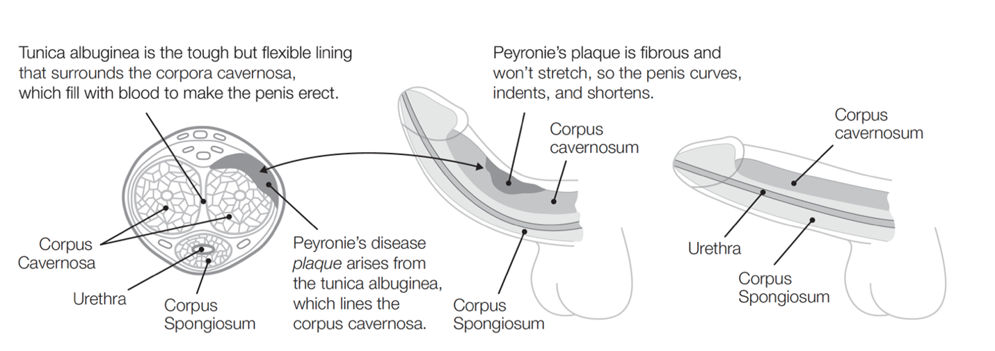 Peyronie's is an area of disorganized collagen within the shaft of the penis which is called a “plaque”. It is not the same as plaque in diseased blood vessels or plaque on the teeth. It is comprised of collagen and sometimes calcium deposits and it arises from the lining of the two cylindrical chambers of the penis that fill with blood and that elongate and widen during an erection.